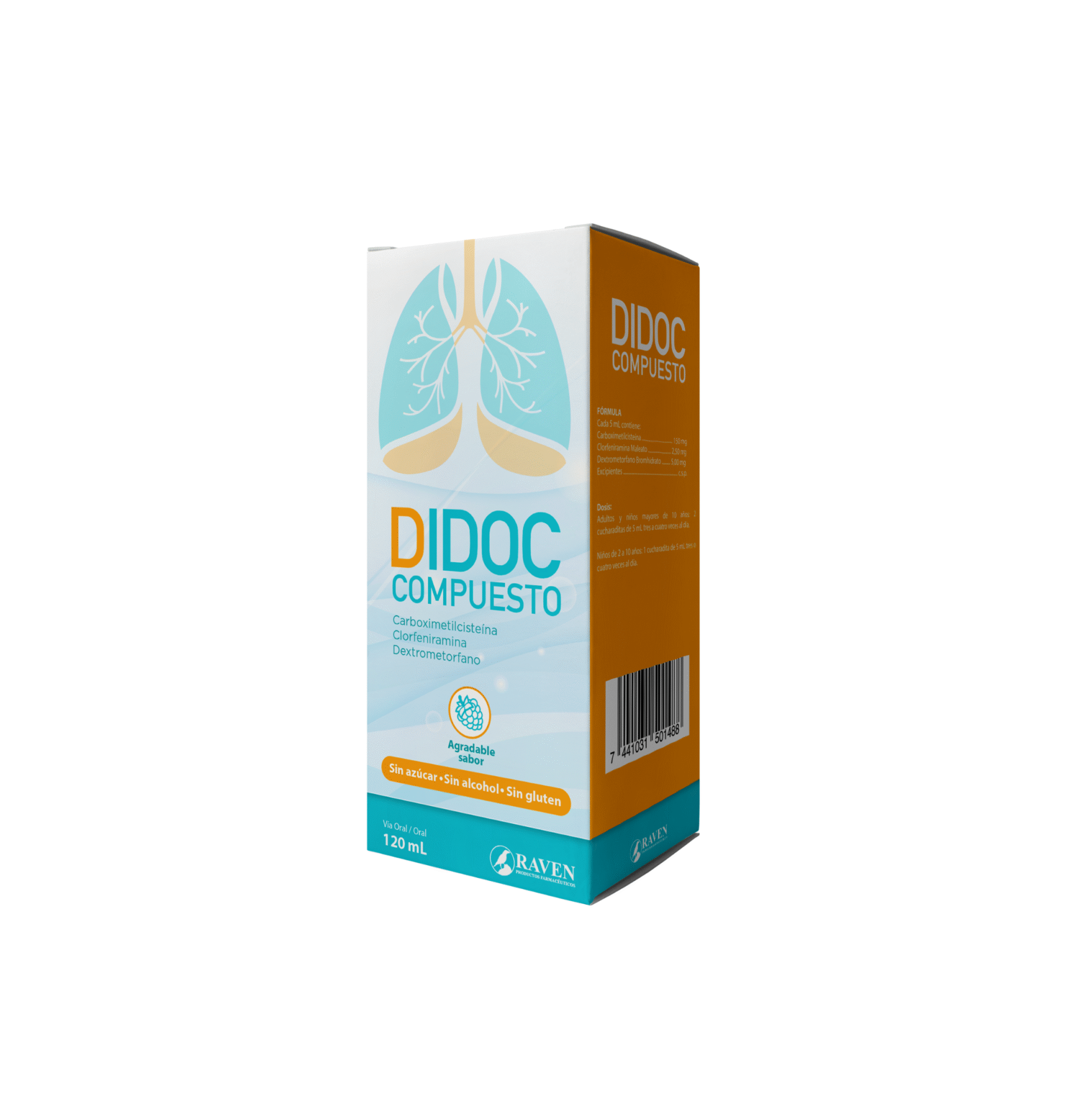 Componentes: Carboximetilcisteína 150mg/5mL, Clorfeniramina maleato 2.50mg/5mL, Dextrometorfano bromhidrato 5.00mg/5mL, Exc. c.s.