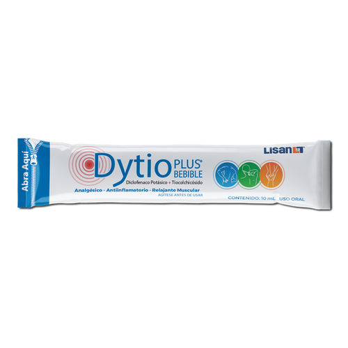Componentes: cada sobre 10ml contiene: Diclofenaco potásico 50mg, tiocolchicósido 4mg, Exc. c.s.