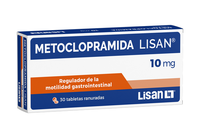Metoclopramida 10mg Lisan tabletas caja por 30 unidades.