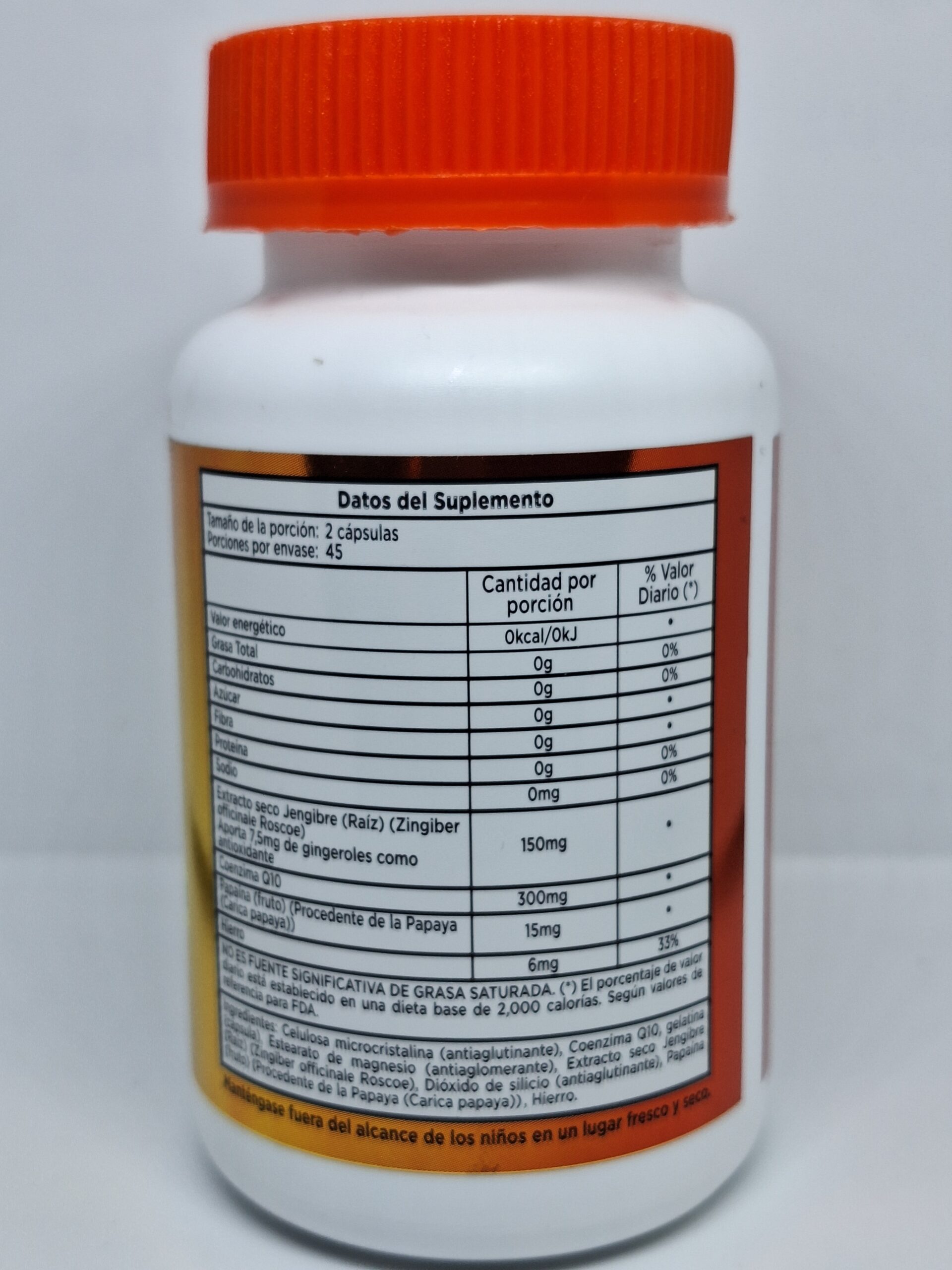 Cada cápsula contiene enzimas digestivas, papaina, jengibre, coenzima Q10 e hierro.