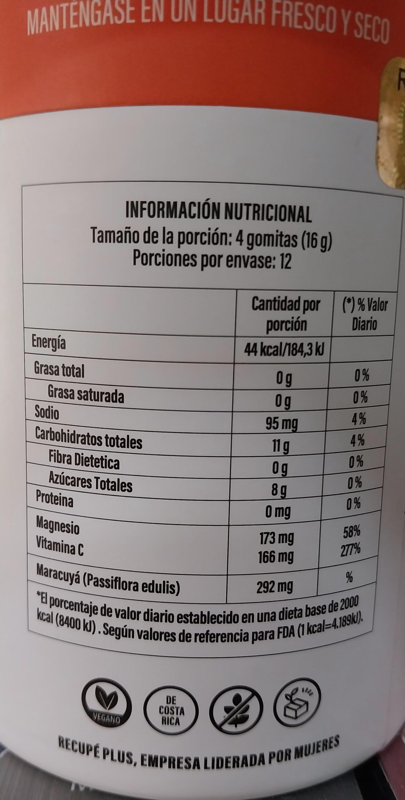 Suplemento alimenticio en gomitas a base de maracuyá citrato de magnesio y vitamina C.