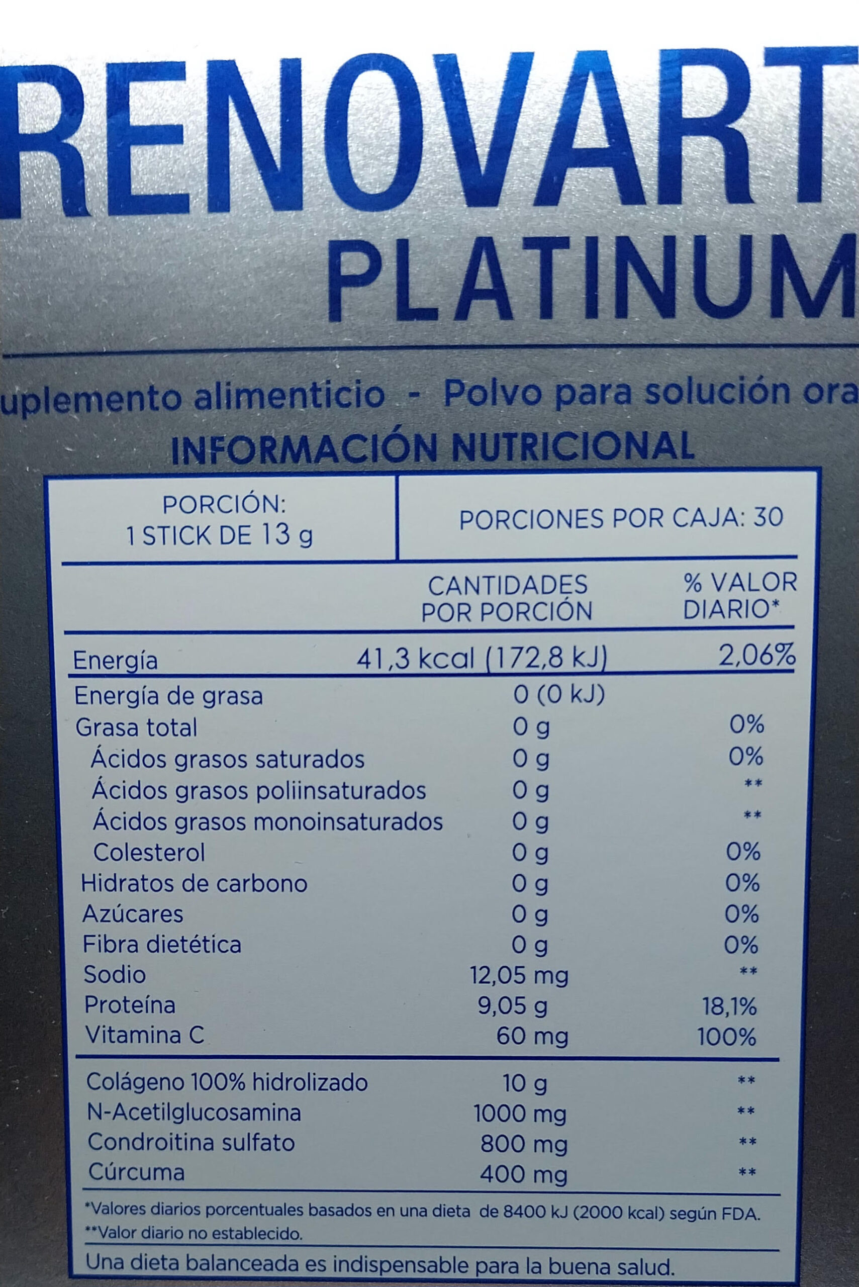 Colágeno 100% hidrolizado 10g. Contiene Cúrcuma 400mg, Condroitina sulfato 800 mg, N-Acetilglucosamina 100mg y Vitamina C 60mg.